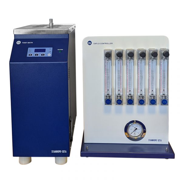 The solid block bath can accept up to 6 sets of oxidation glassware. The layout of the heating elements give an even temperature distribution and the integral Setatemp 50K Temperature Controller ensures stability over extended test times. Safety features include over-temperature cut-out.